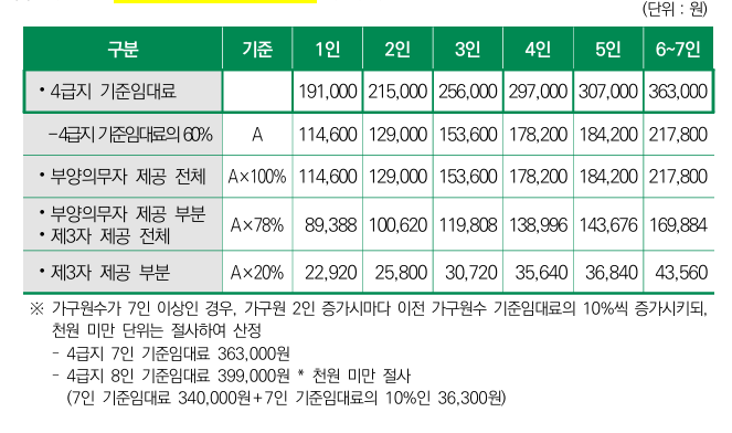 - 2인가구(부모님)/전체사용대차(현관문따로)/부양의무자(결혼한자녀)제공 → 사적이전소득 129,600원 부과